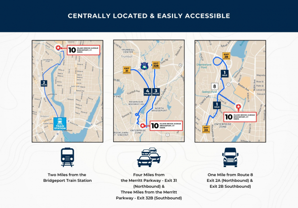 Strategically located just one mile from Route 8 (Exit 2A), the site provides rapid access to major regional thoroughfares. The property is also approximately two miles from the Bridgeport Train Station, offering convenient Amtrak and Metro-North rail service for commuters and intercity travel.