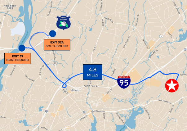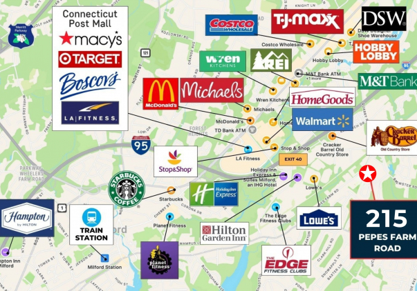 The location offers excellent accessibility just 1.4 miles from I-95 (Exit 40) and 4.8 miles from the Merritt Parkway (Exit 37), while also being close to key transportation hubs such as the Milford Train Station (2.6 miles), Tweed New Haven Airport (11.9 miles), and Sikorsky Memorial Airport (11.9 miles) . In addition to convenient highway access, the property is surrounded by major retail and service destinations, including the Connecticut Post Mall—the largest mall in the state at over 1.3 million square feet—anchored by Macy’s, Target, Boscov's, Dick's Sporting Goods, and LA Fitness. Nearby amenities also include Walmart, HomeGoods, Lowe’s, Cracker Barrel, Hilton Garden Inn, Holiday Inn Express, and M&T Bank, ensuring a vibrant business environment and convenience for employees and clients alike.