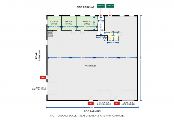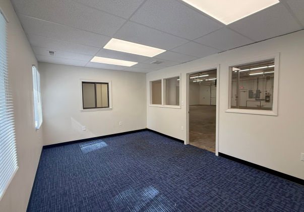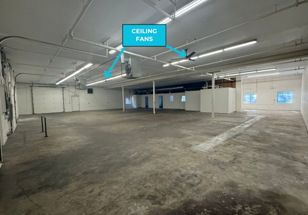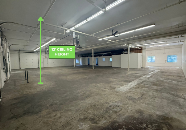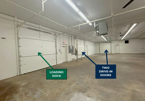 Description: he available space is located at the rear of the street-facing building and includes a warehouse with ceiling fans, concrete floors and a 12' ceiling height, three carpeted air-conditioned private offices, and a private restroom. It is well-equipped with one loading dock and two drive-in doors, making it ideal for a variety of industrial, warehouse, and commercial uses. |
