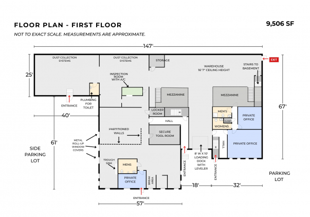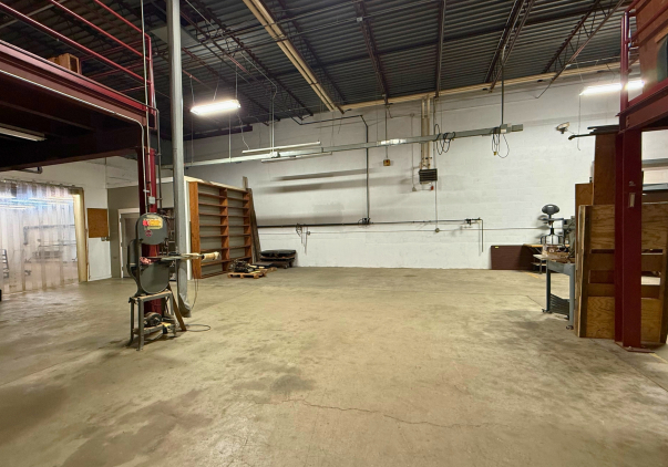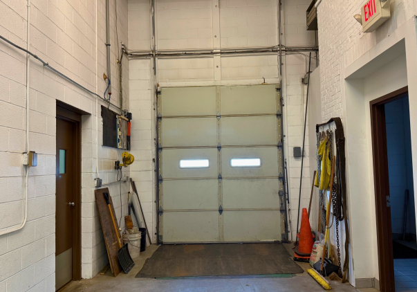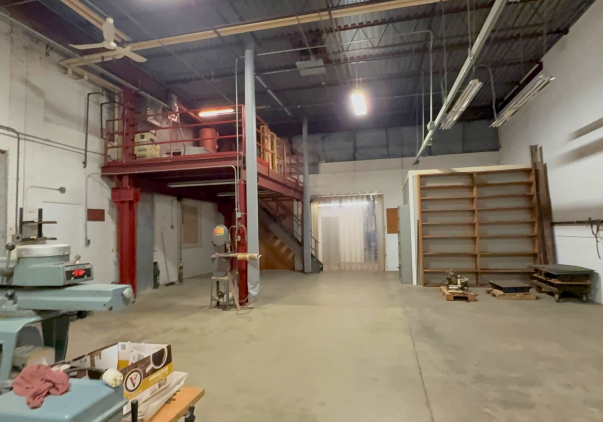 The two-story industrial building offers a functional and efficient layout with 16-foot ceilings in the warehouse and partial central air conditioning. The first floor features an 8' W x 10' H loading dock with leveler, front dock access, an inspection room, a secure tool room, a locker room, two mezzanines, three restrooms, and air-conditioned office space, including one private office. Additional features include LED lighting, live bus bars with 220V and 110V plugs, and an air compressor located on the mezzanine.