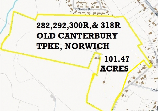 Four parcels (282, 292, 300R and 318R) Old Canterbury Turnpike combined for a total of 101.47 acres. Located 1.1 miles and 3 minutes off Interstate 395, exit 18. An extra wide driveway leads up to the very private property. The acreage is high and dry except for a very small bit of wetlands to the rear of 318R. It is estimated that ~70 acres could be developed. Some of the property was formerly a Christmas tree farm and has been >60% cleared. There is currently a clear span 96 ft. wide x 140 ft. long x 32 ft. high fabric building that can be sold with the property or removed. 657 feet of frontage. Part of 318R goes straight down to Old Canterbury Turnpike allowing for shorter access to public utilities (water/gas/sewer) all less than 1/4 mile away. The property is almost next door (<1 mile) to Norwich Business Park North which is currently under development. Zoned R80. Buyer to do all due-diligence, taxes currently in PA490. By appointment only!