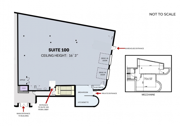 | Description: Suite 100 is a 7,406 RSF industrial flex space with full HVAC for lease at $20/RSF Gross + Utilities. The warehouse space is accessible through two private entrances and two drive-in doors for seamless street-level loading. It is equipped with heavy power (2,000 amps), a 16' 3” ceiling height, an office, a kitchenette/breakroom, and a private restroom with a shower. Overlooking the warehouse is a 704 SF mezzanine, which includes two additional offices, adding functional workspace to the unit. | |