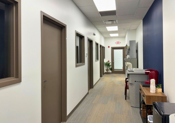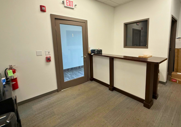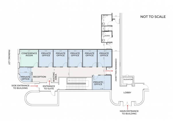 Suite 120 | 1,775 RSF Office Sublease ($23/RSF Gross + Utilities): Available through April 30, 2028 (with extension options), this efficient first-floor suite is move-in ready. The layout includes a reception/waiting area, a conference room, and seven private offices. It offers dual access via the main lobby and a convenient side entrance.