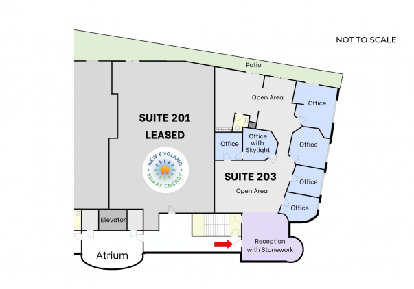 Suite 203 | 3,228 RSF Modern Office Suite ($25/RSF Gross + Utilities): Currently undergoing a comprehensive remodel, this second-floor suite offers a high-end corporate environment. It features a professional reception area, six private offices, a kitchenette, and a private restroom. Notable highlights include skylights and exclusive access to a private outdoor patio.