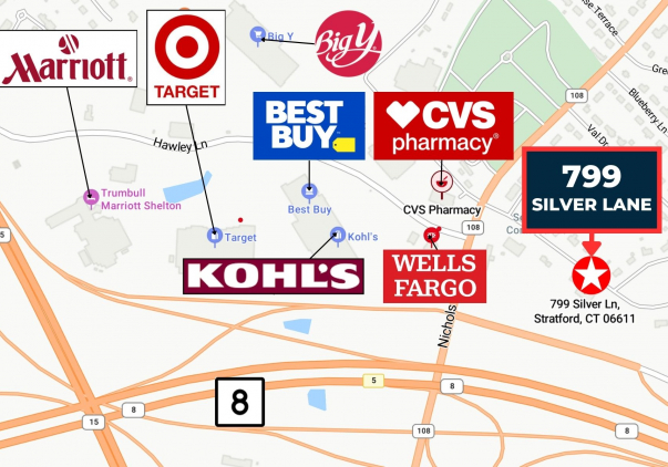 The property is highly accessible, located 0.6 miles from Route 8, 1.5 miles from the Merritt Parkway/Route 15, 1.6 miles from Route 25, and 6 miles from I-95. It is 0.2 miles from the Hawley Lane Mall bus stop and 3.2 miles from the Stratford Train Station, providing seamless connections for commuters. Additionally, it is close to retail, dining, and essential services, including Trumbull Marriott, Starbucks, Best Buy, and CVS.