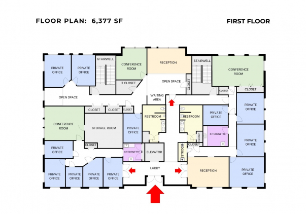 - Versatile Office Space – Private offices, conference rooms, kitchenettes, and restrooms